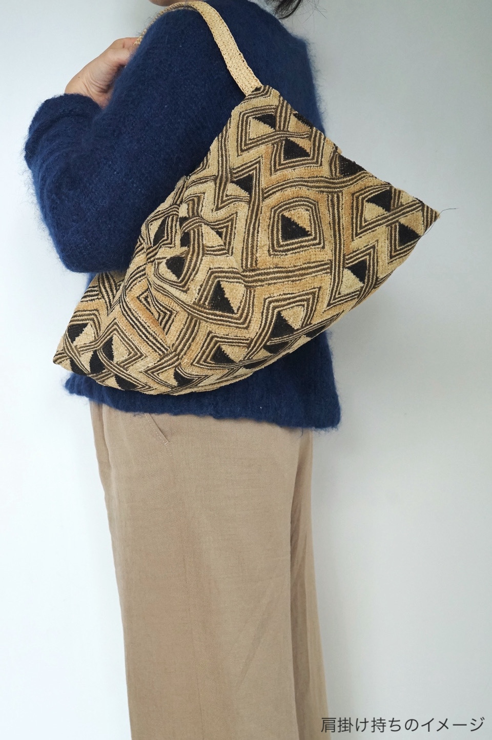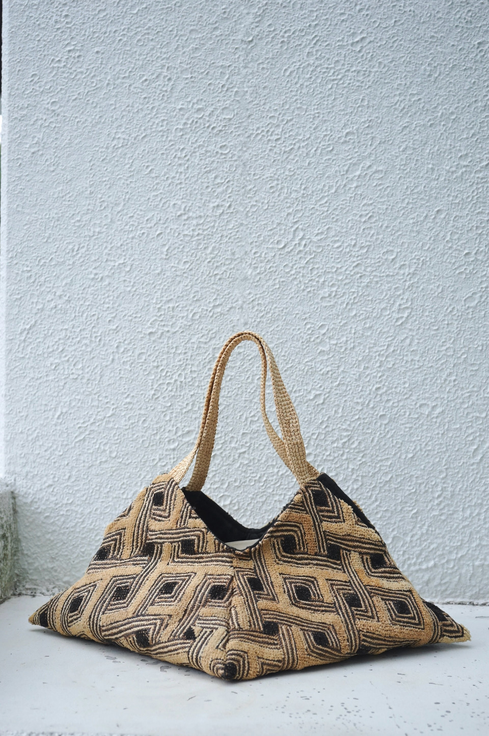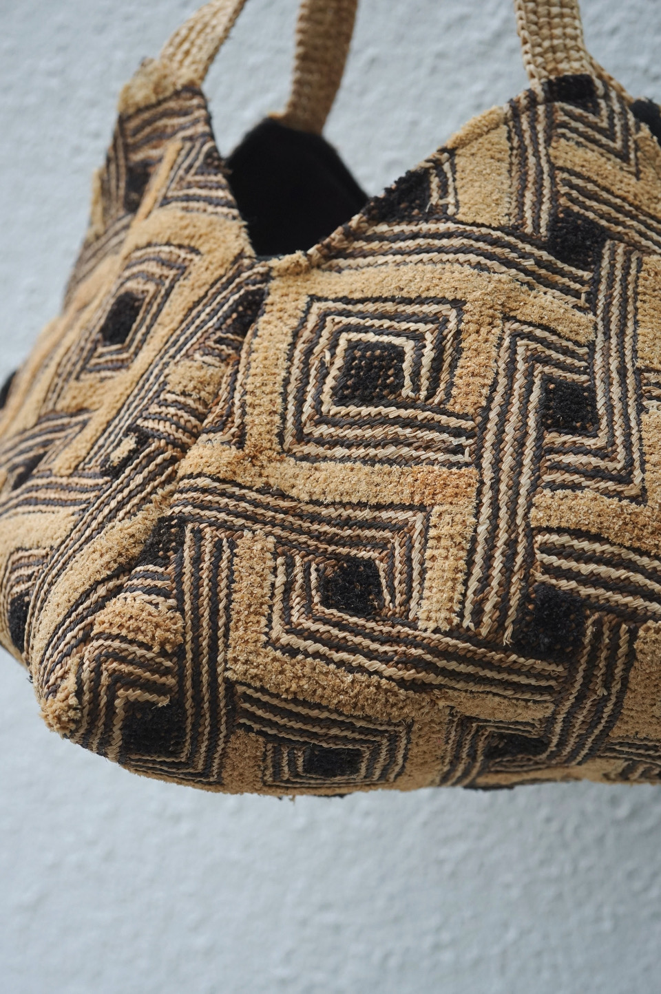 クバ布ならではの柄と質感、1枚布を生かした立体的なデザインが目を惹きます。