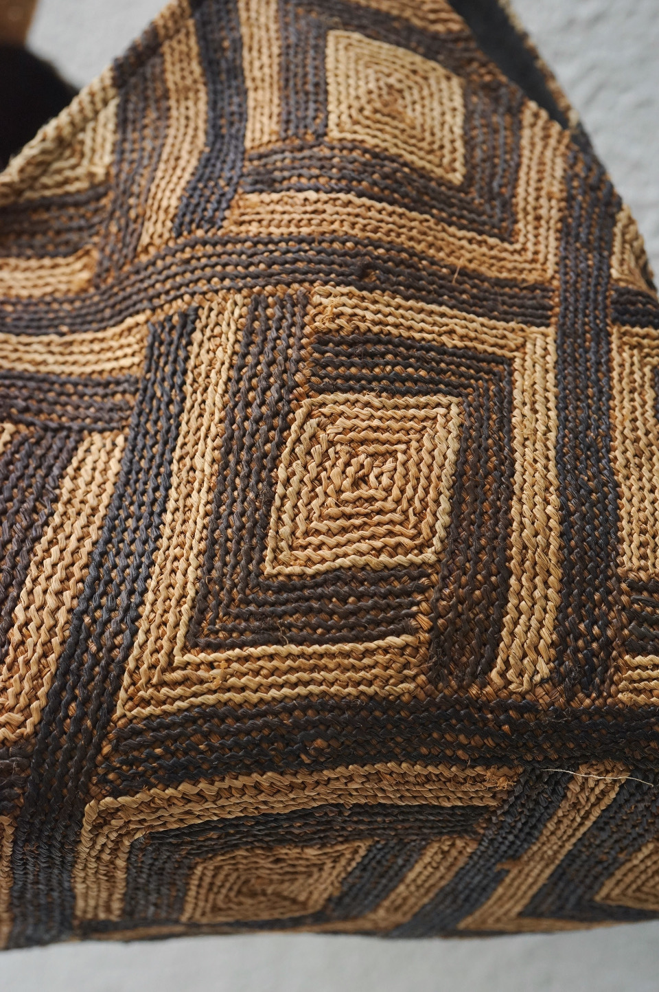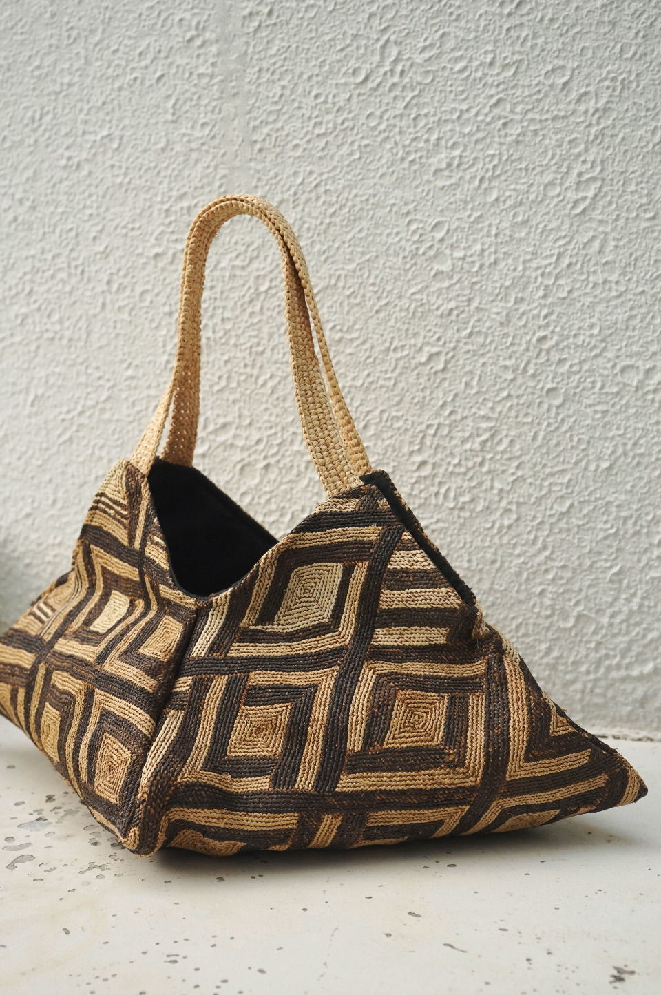 クバ布ならではの柄と質感、1枚布を生かした立体的なデザインが目を惹きます。