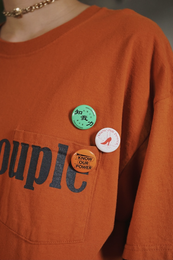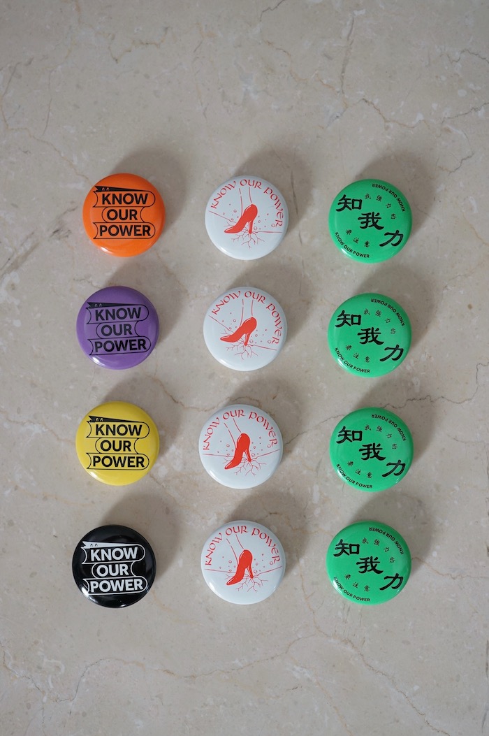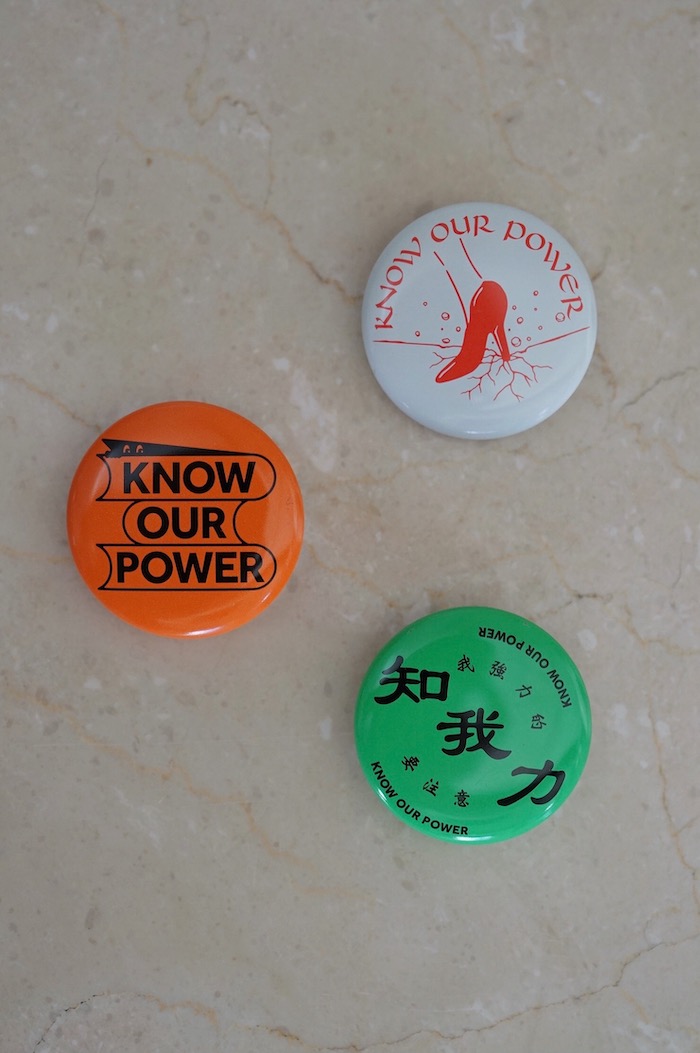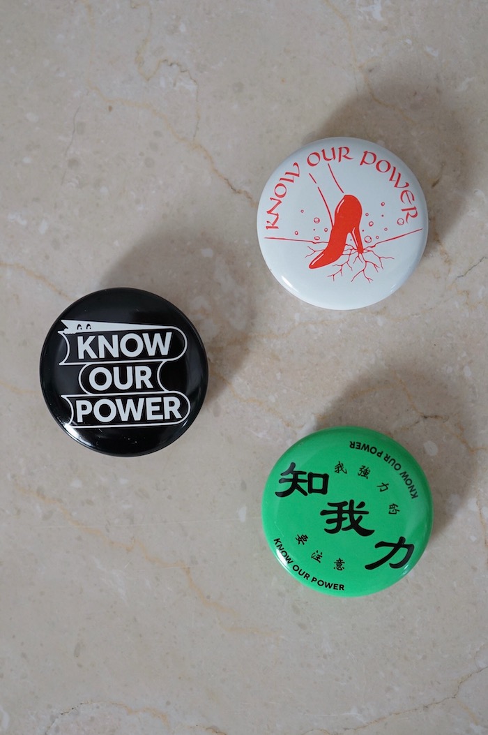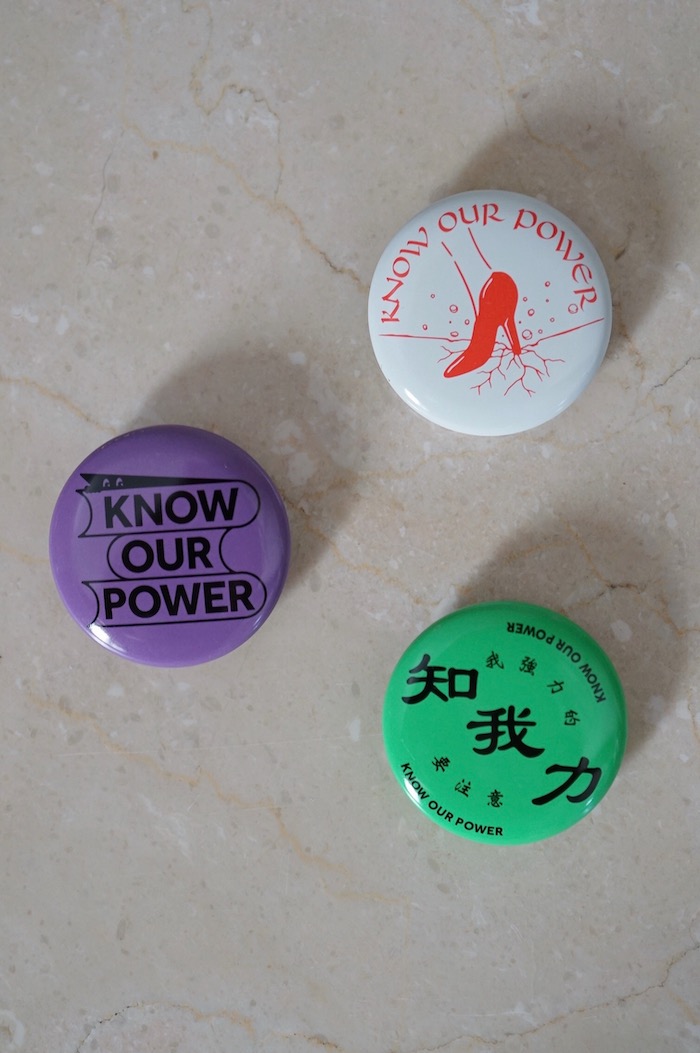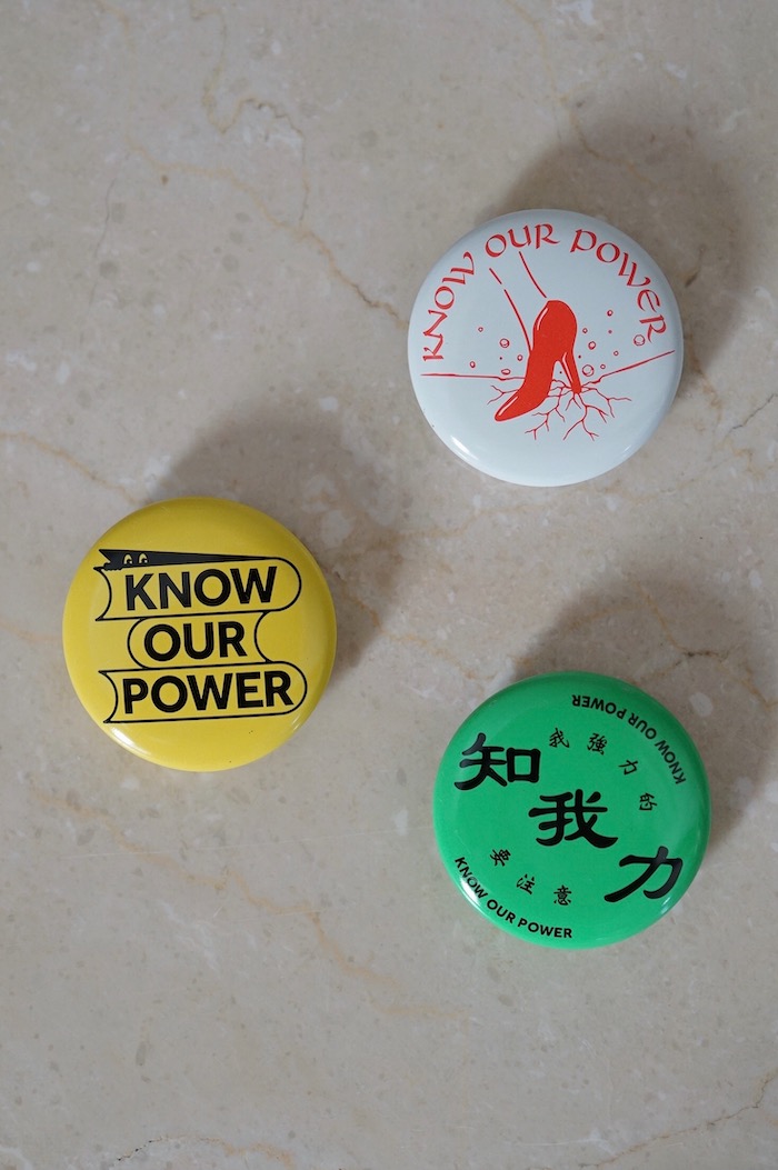 KNOW OUR POWERのグラフィックが印象的な3個セットの缶バッジ。