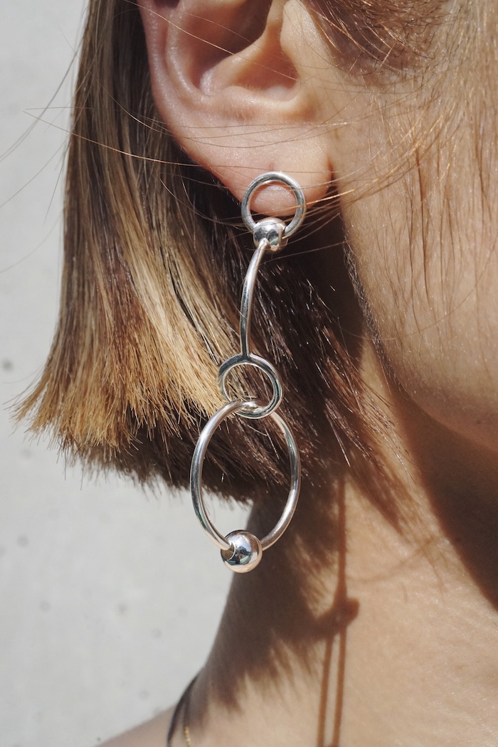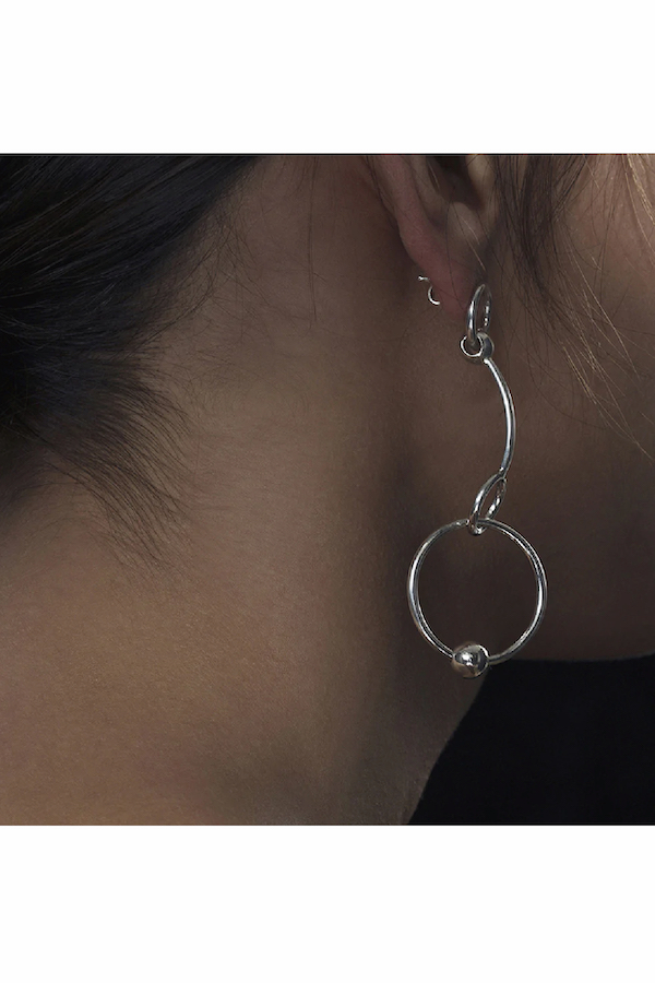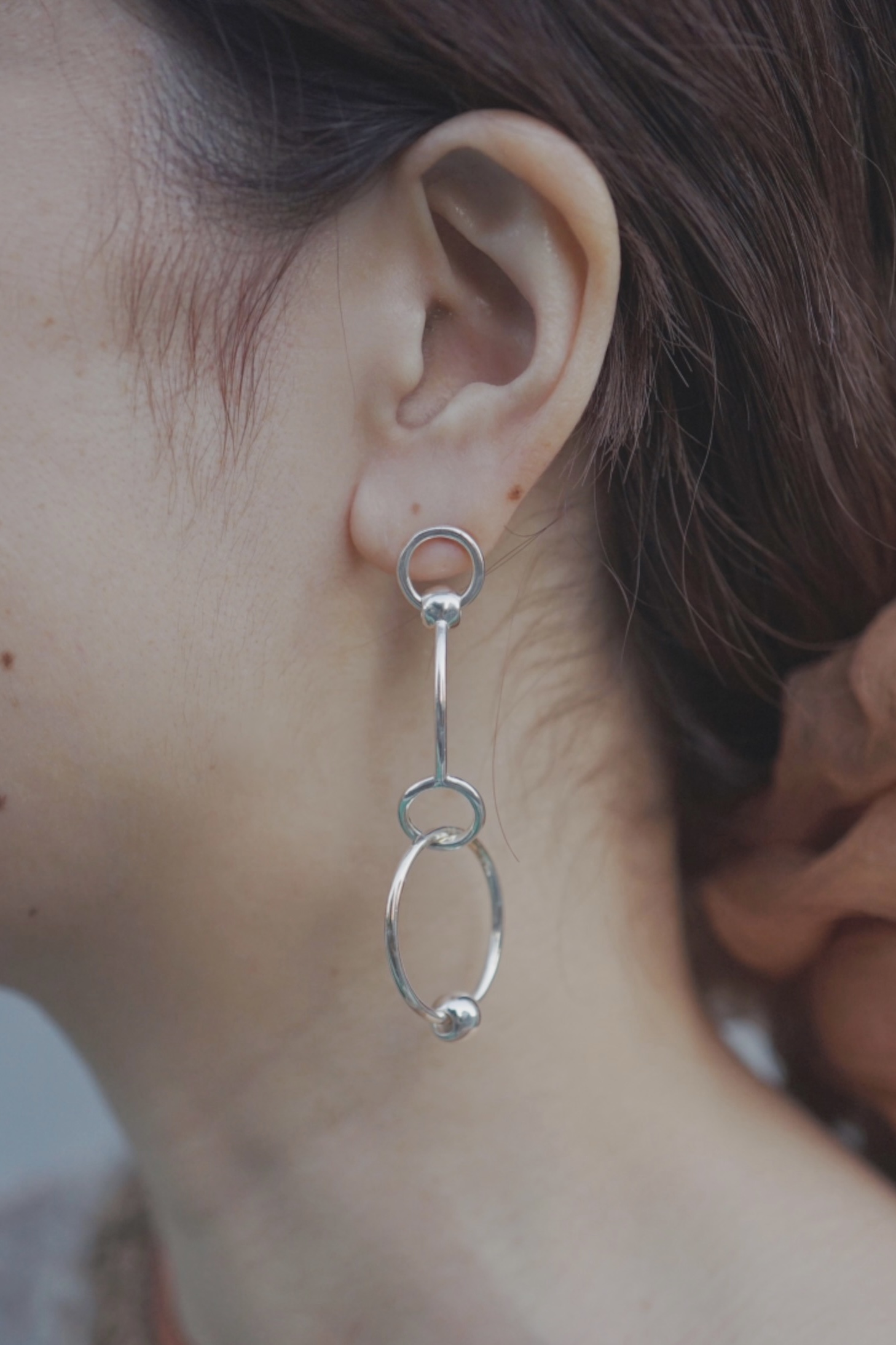 シルバーの円と曲線が生み出す浮遊感が目を惹くこちらのピアス。