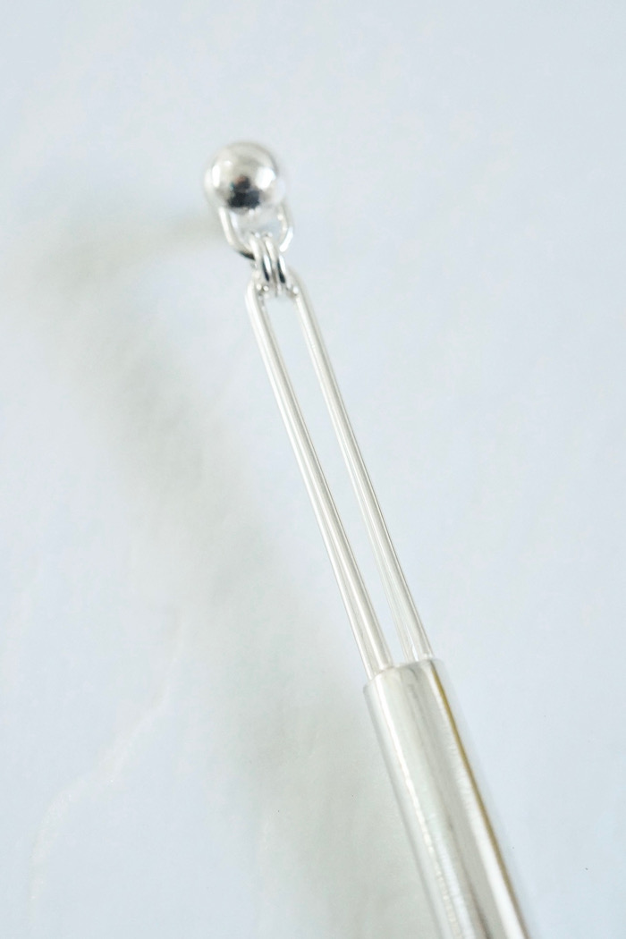 円柱状のユニークで建築的なシルバーの構造と、先端からちらりとのぞく