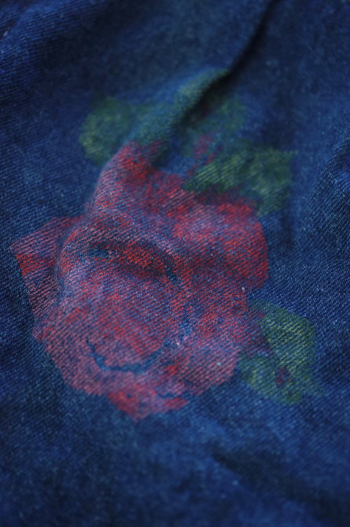 肉厚なデニム地にローズ模様のプリントが施されたテキスタイル。