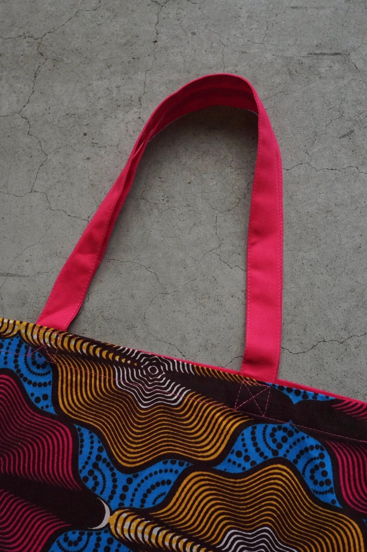 主に西アフリカのプリント生地‘pagne(パーニュ)’で仕立てたトートバッグ。