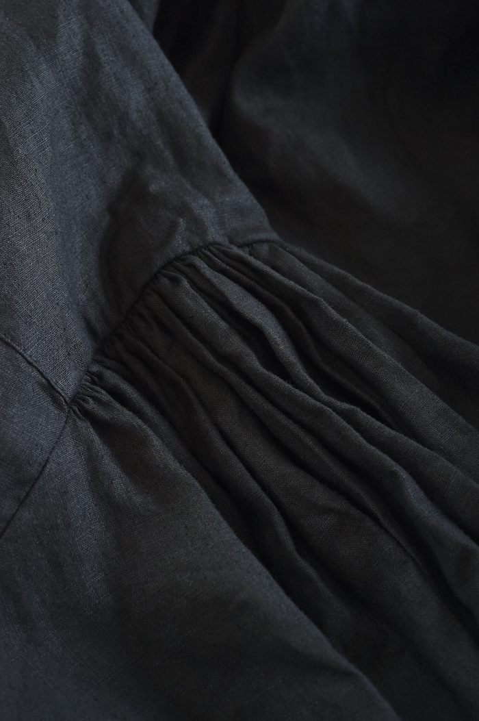 首元、袖山、袖口、背中にふんだんにギャザーをいれ