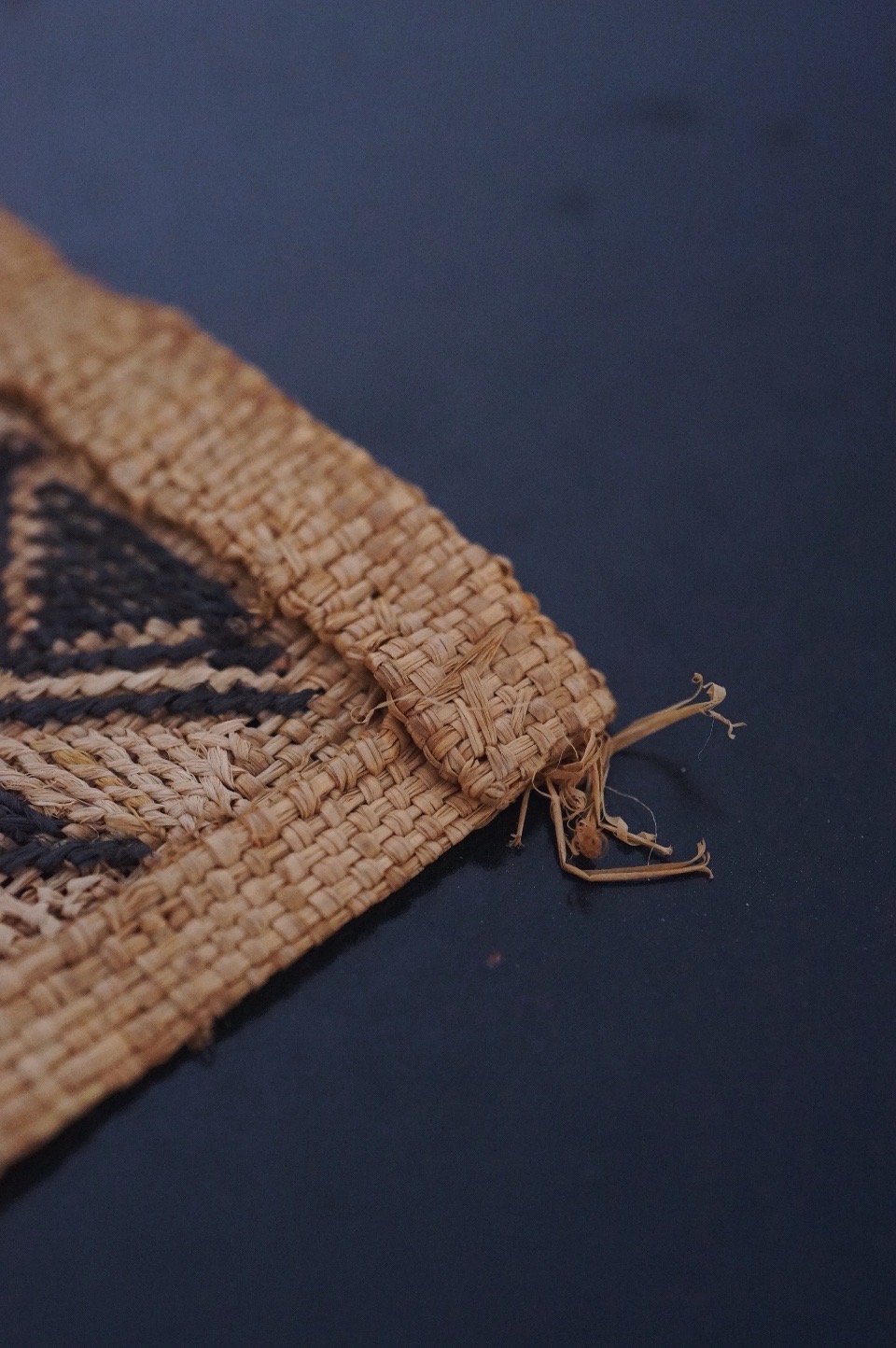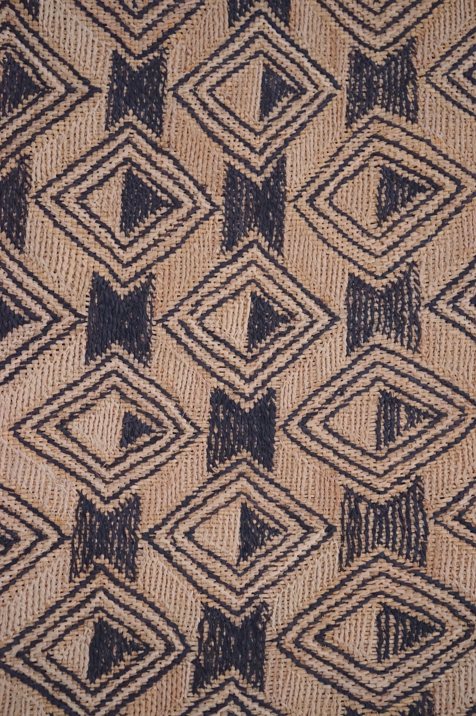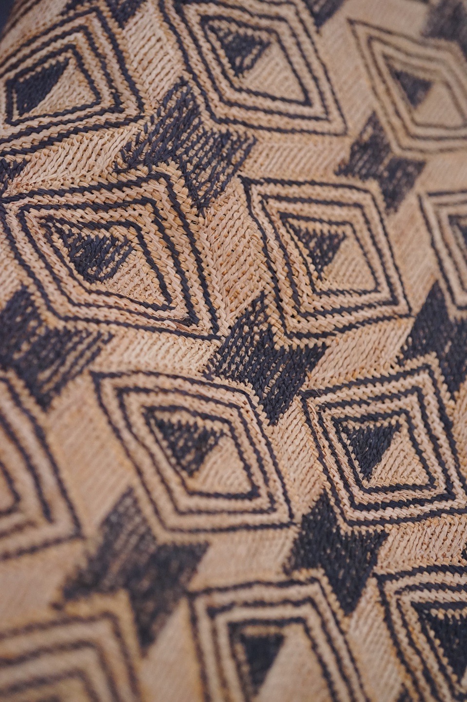 平織のラフィアの生地に2種類の刺繍の技法を組みああせて作られています。