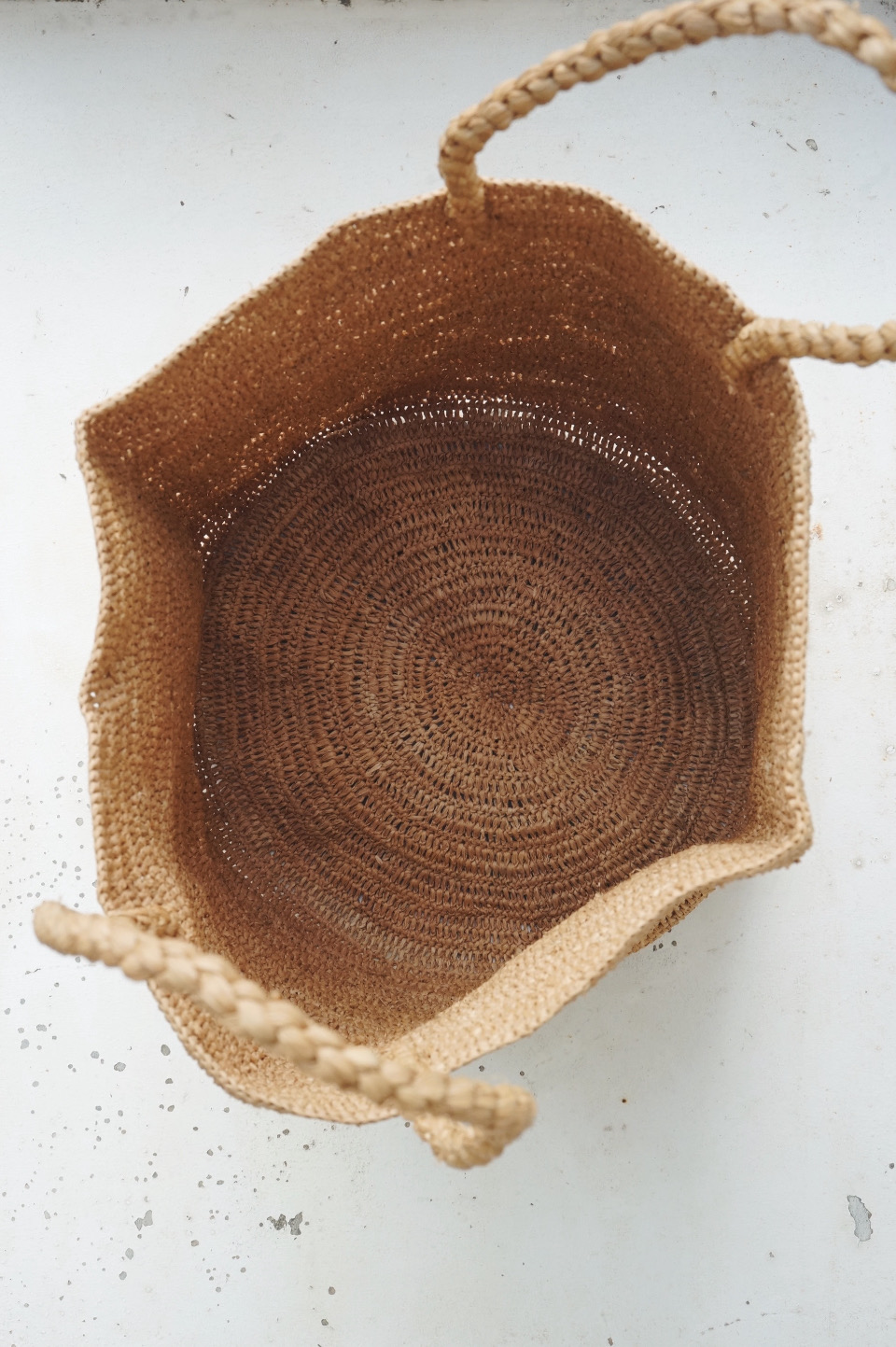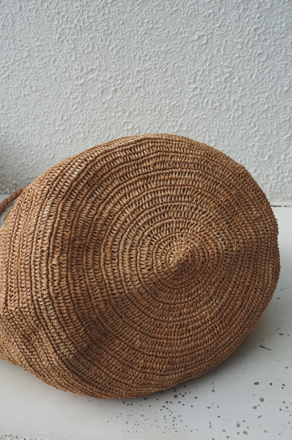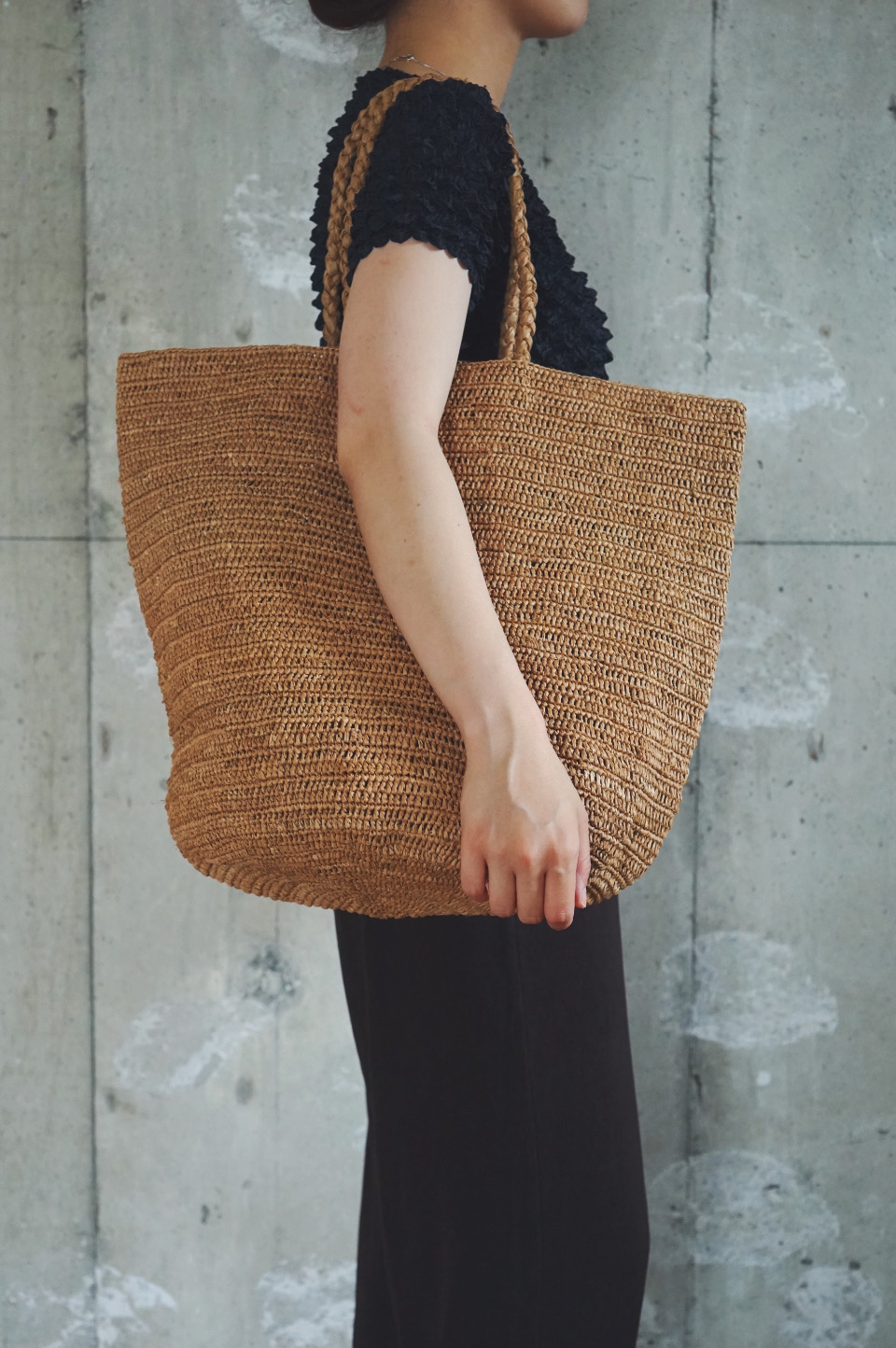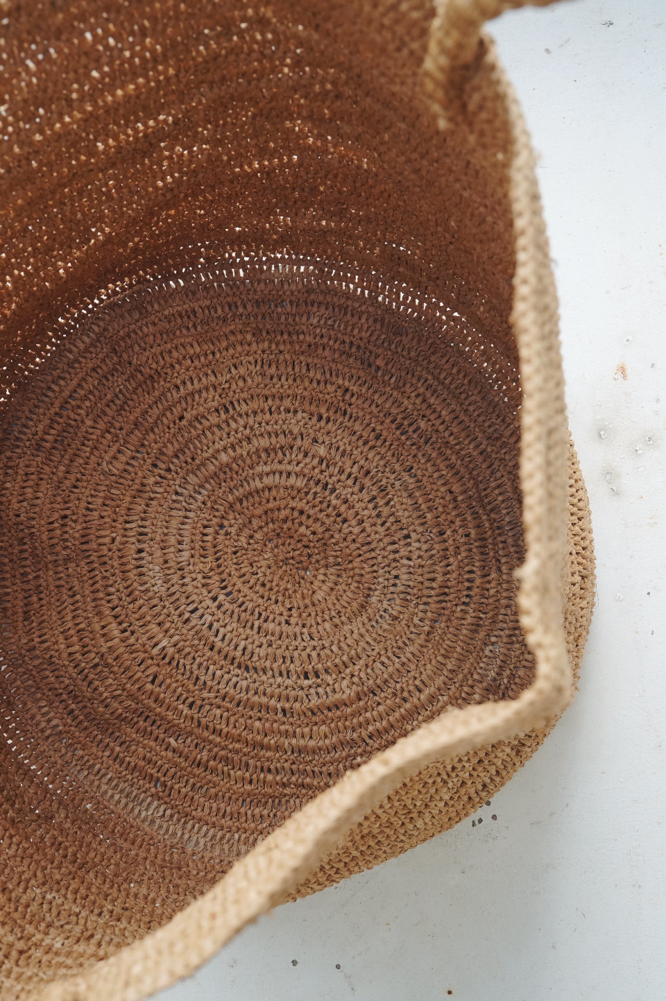 紅茶染めラフィア糸でかぎ編みした丸底タイプのトートバッグ。