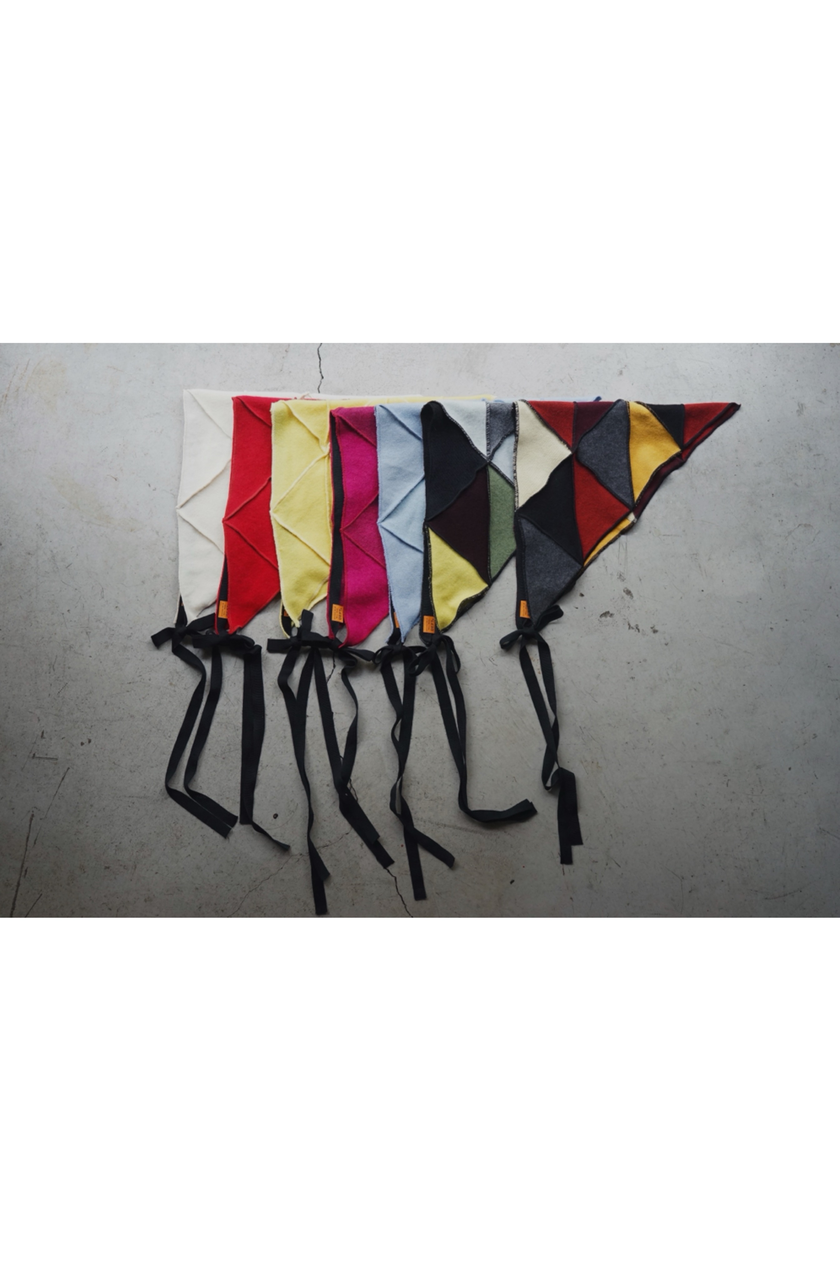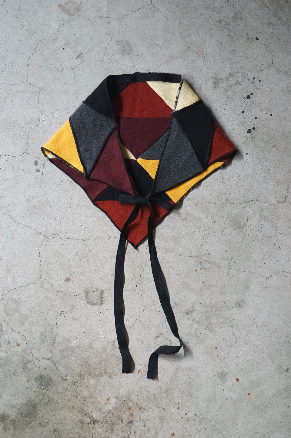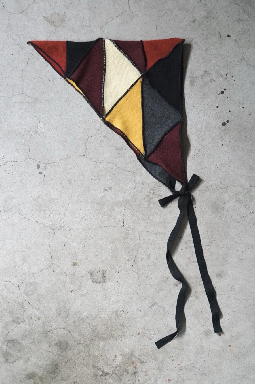 メローロックで繋ぎ合わせて仕立てたパッチワークのバブーシュカ。