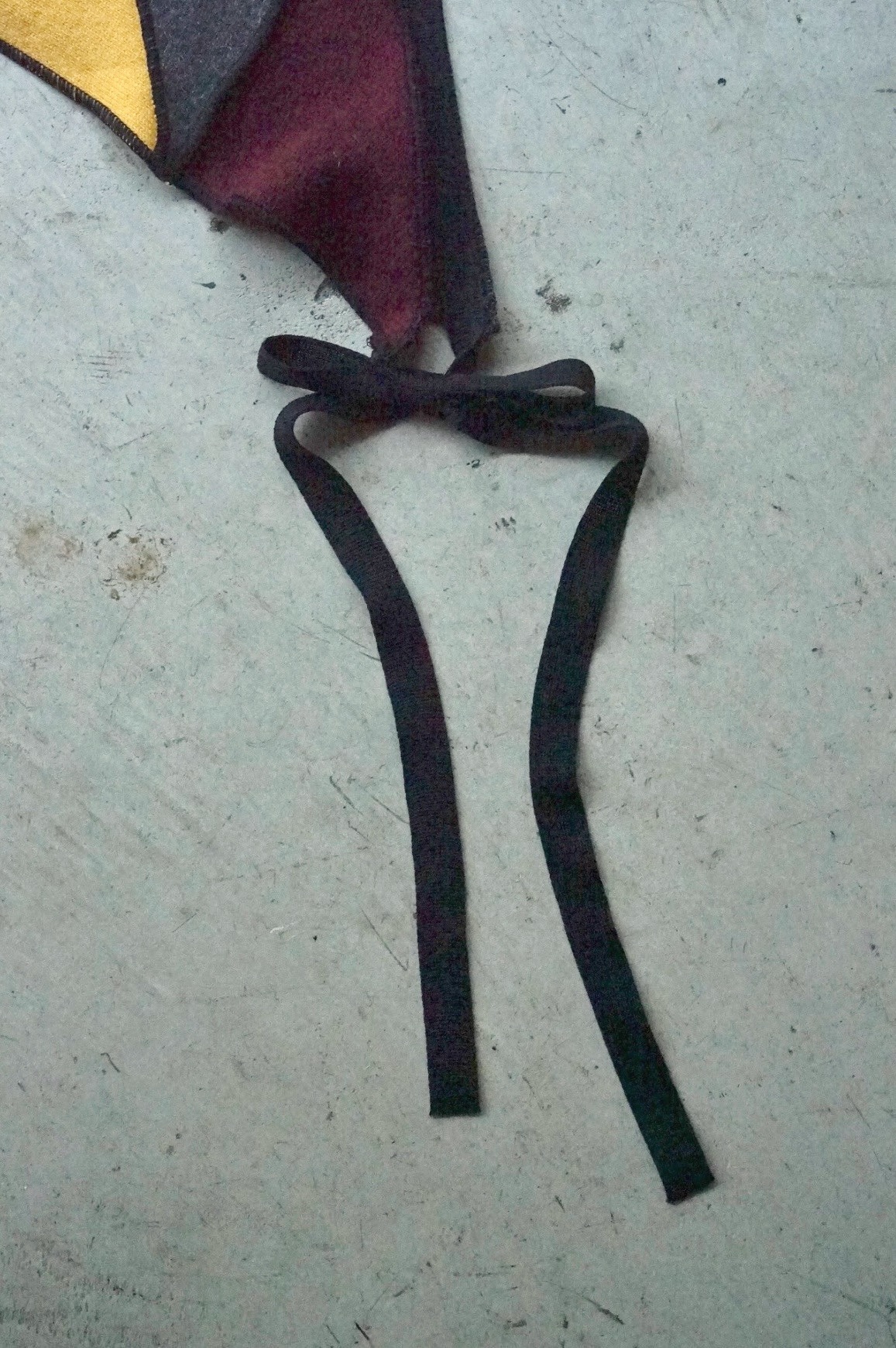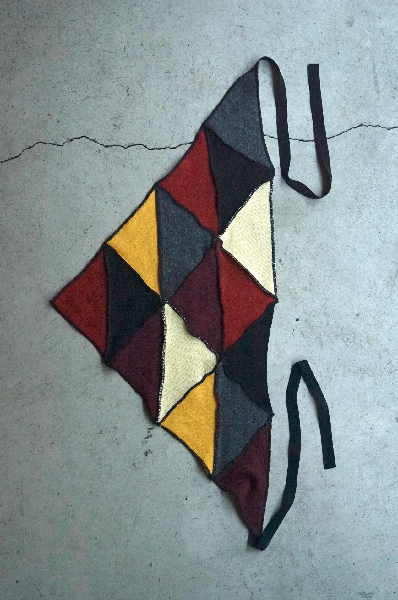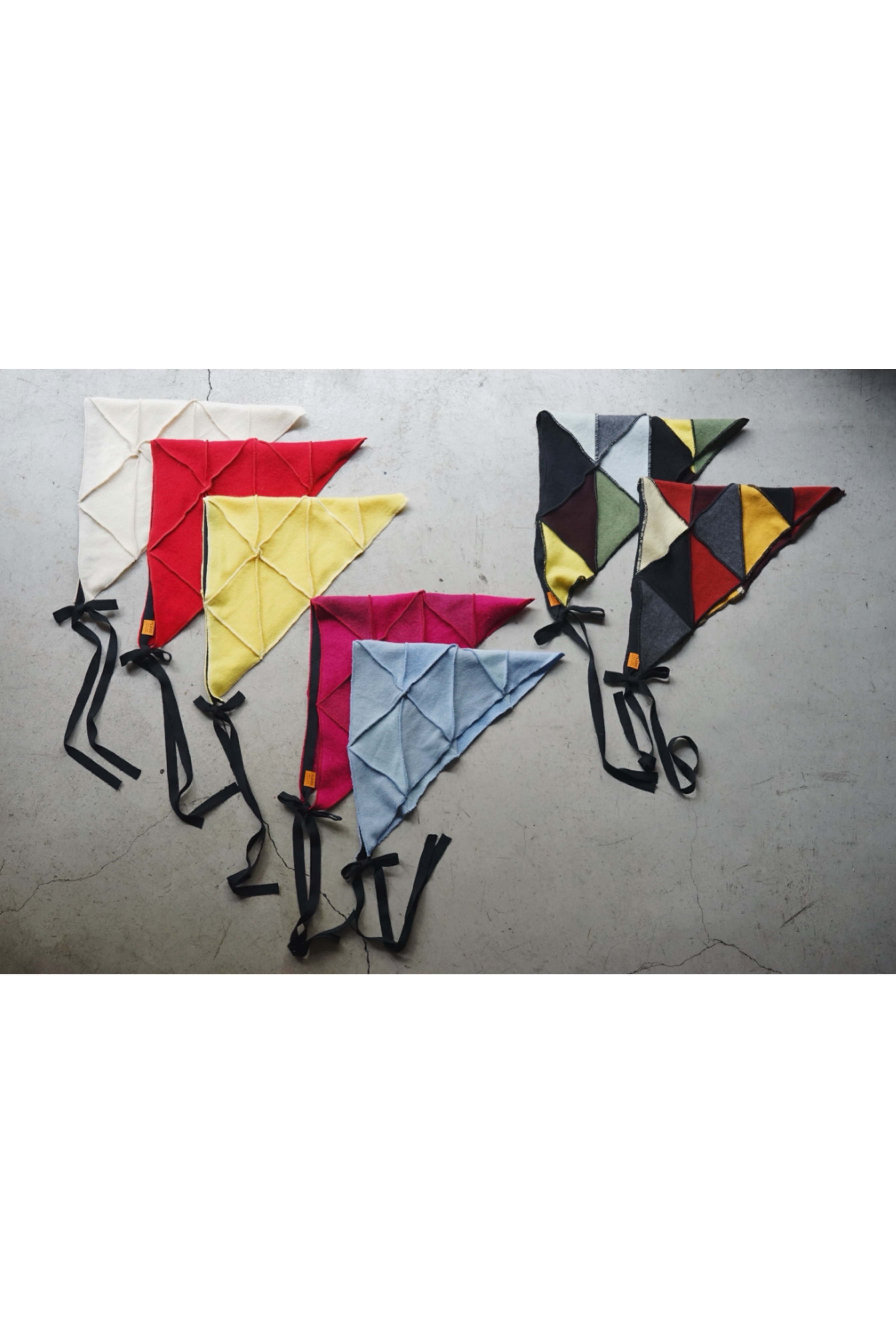 メローロックで繋ぎ合わせて仕立てたパッチワークのバブーシュカ。